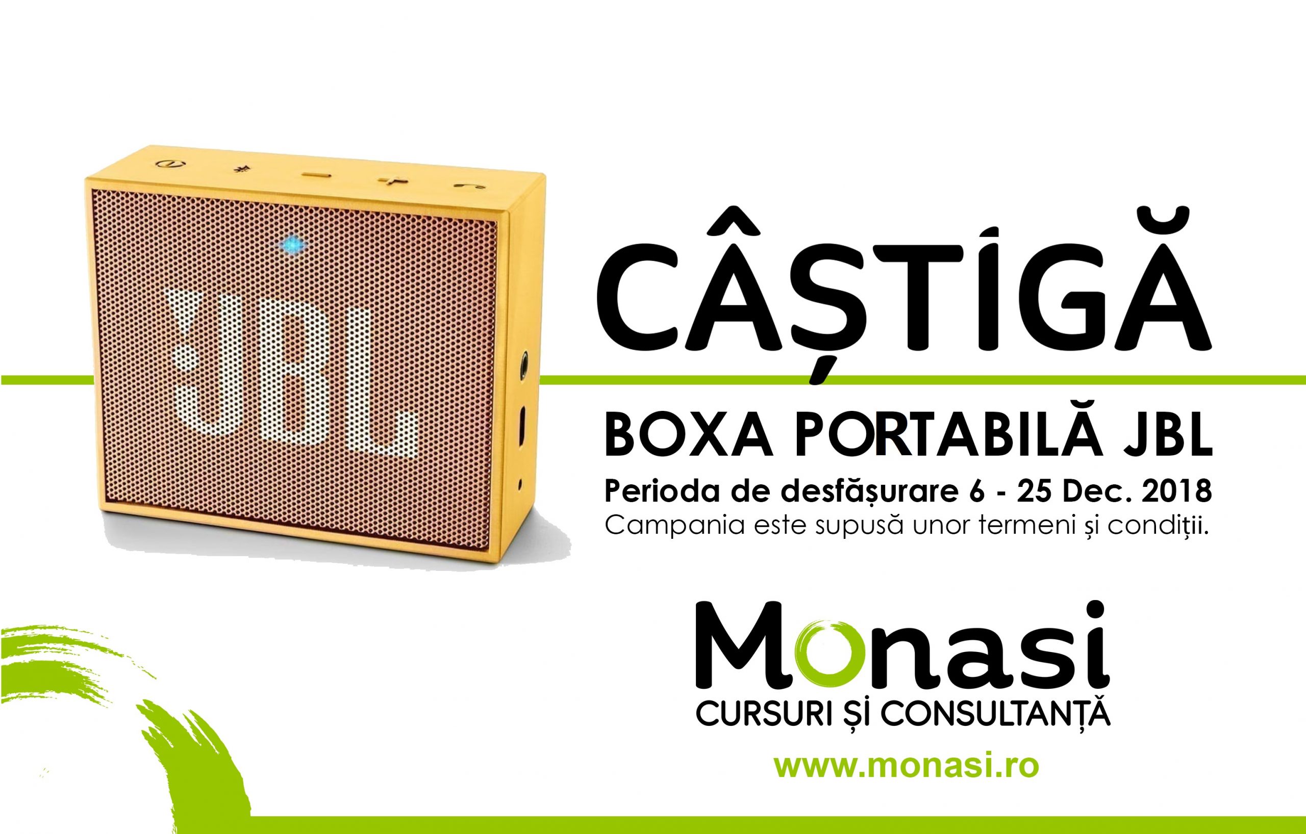 Concursul “Câștigă o Boxă Portabilă JBL” este organizat de SC Monasi Cursuri și Consultanță SRL cu sediul în Acățari, nr. 275, județul Mureș înegistrată la Registrul Comerțului – sub nr J/26/1170/2018 și CUI 39689092 Mureș.