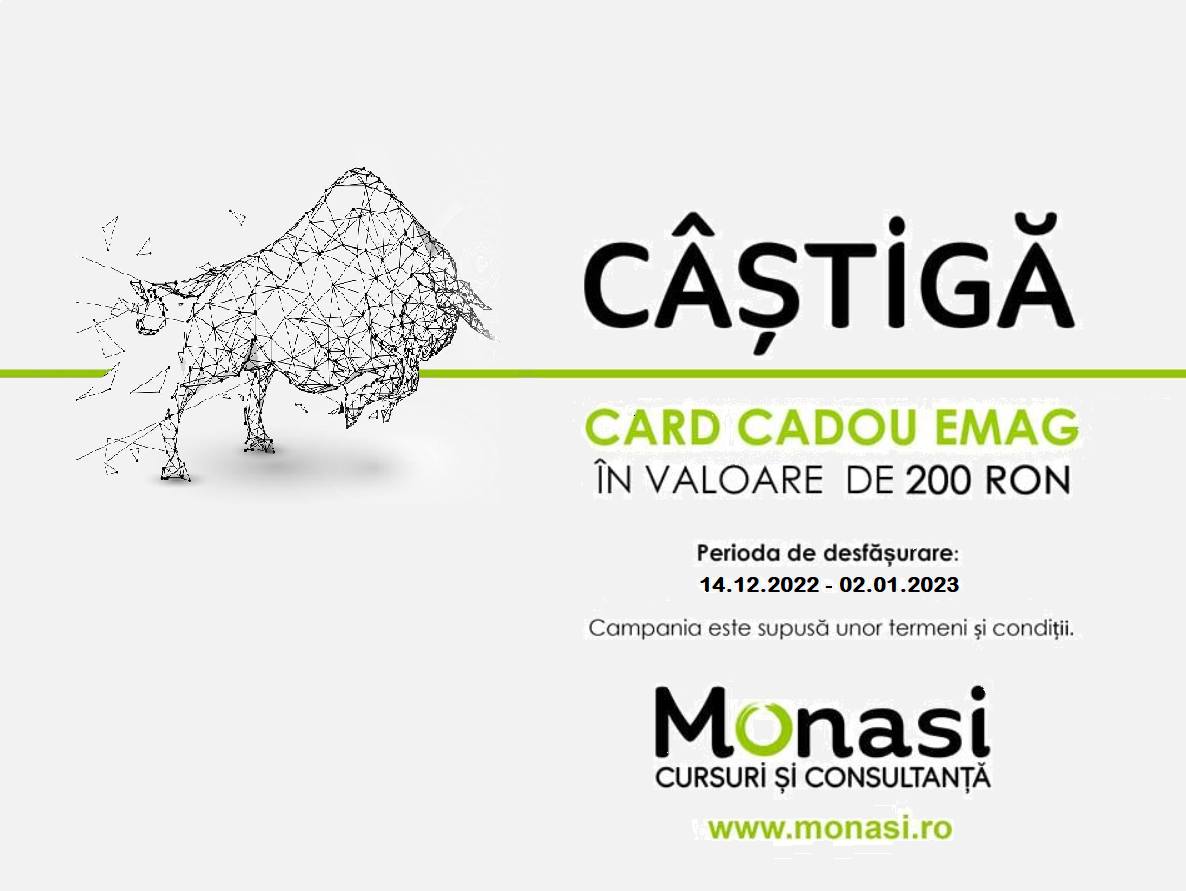 Concursul “Câștigă un Card Cadou Emag în valoare de 200 RON” este organizat de SC Monasi Cursuri și Consultanță SRL cu sediul în Acățari, nr. 275, județul Mureș înregistrată la Registrul Comerțului – sub nr J/26/1170/2018 și CUI 39689092 Mureș.
